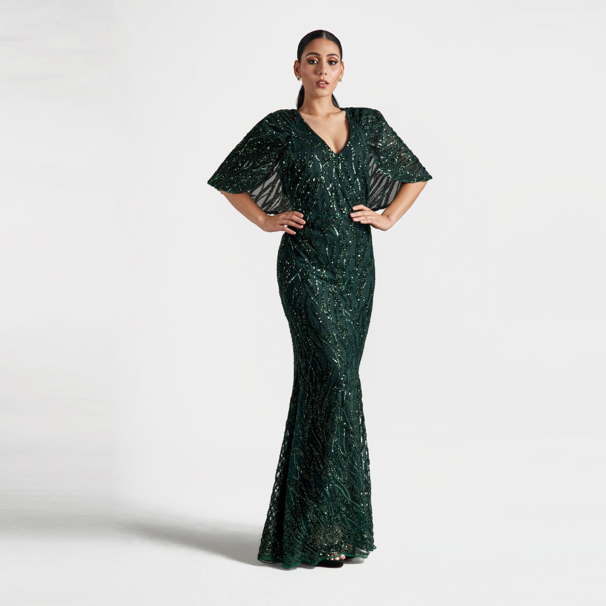 Indulge in pure luxury with The Kate. This stunning capelet gown features an exquisite beaded mesh, delicately ending in a... Read more