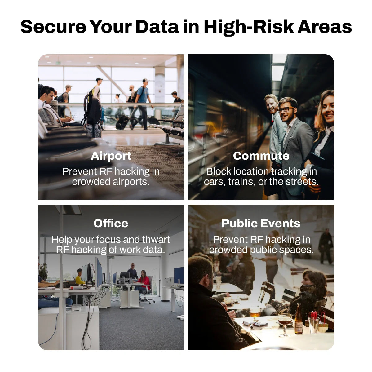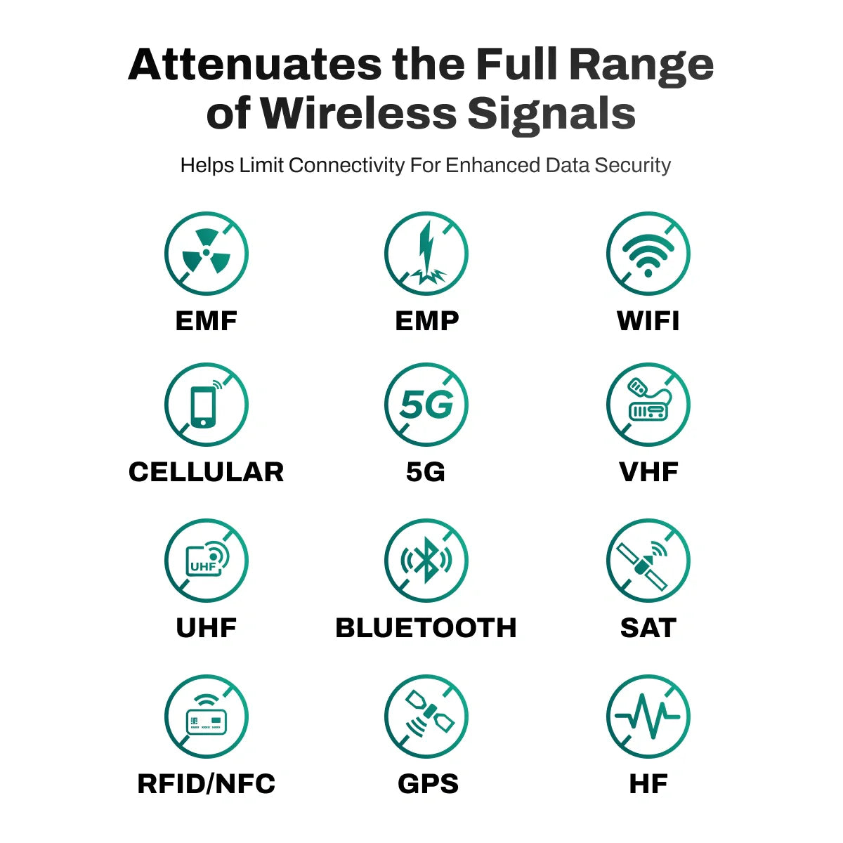 Signals blocked: Cellular (1G–5G), Wi-Fi, Bluetooth, GPS, RFID, NFC, and radio frequencies.