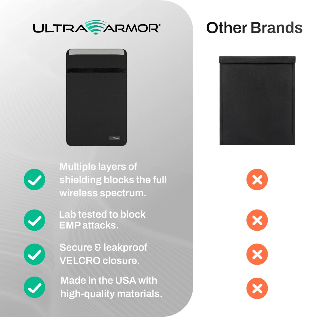 If you’re curious about the science behind these materials, our article on What Are Faraday Bags Made Of? explains the multi-layer shielding fabrics that power Ultra Armor technology.